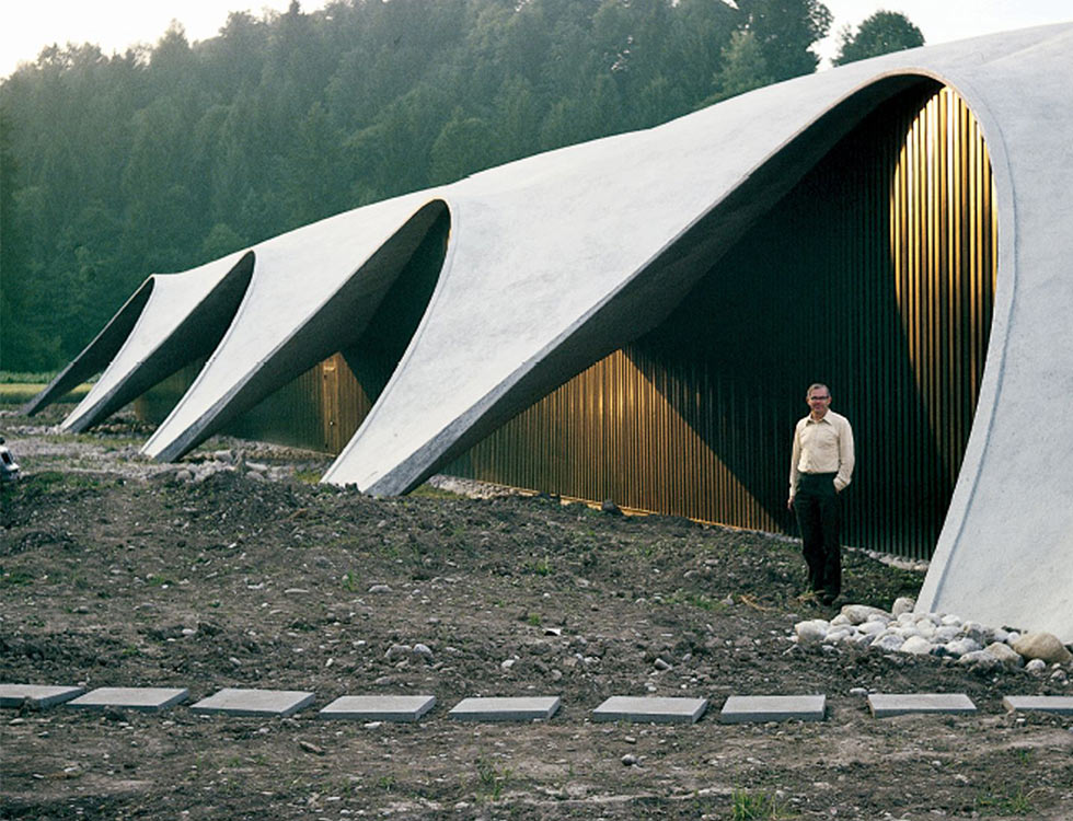 In 1965, Heinz Isler combined his practical and theoretical knowledge of construction to ensure that his concrete roof structures did not crack, therefore omitting the requirement for waterproofing. He achieved this through compression in his shell structures (Figure above left & above right) and through pre-stressing in flat roofs. The designs were carried out without the aid of computers and the resulting structures were simple to understand, efficient in terms of materials, and many of them were selected on the grounds of their lower cost. He used one of these structures as his offices for 40 years without defect. Would engineers be as forthright today?