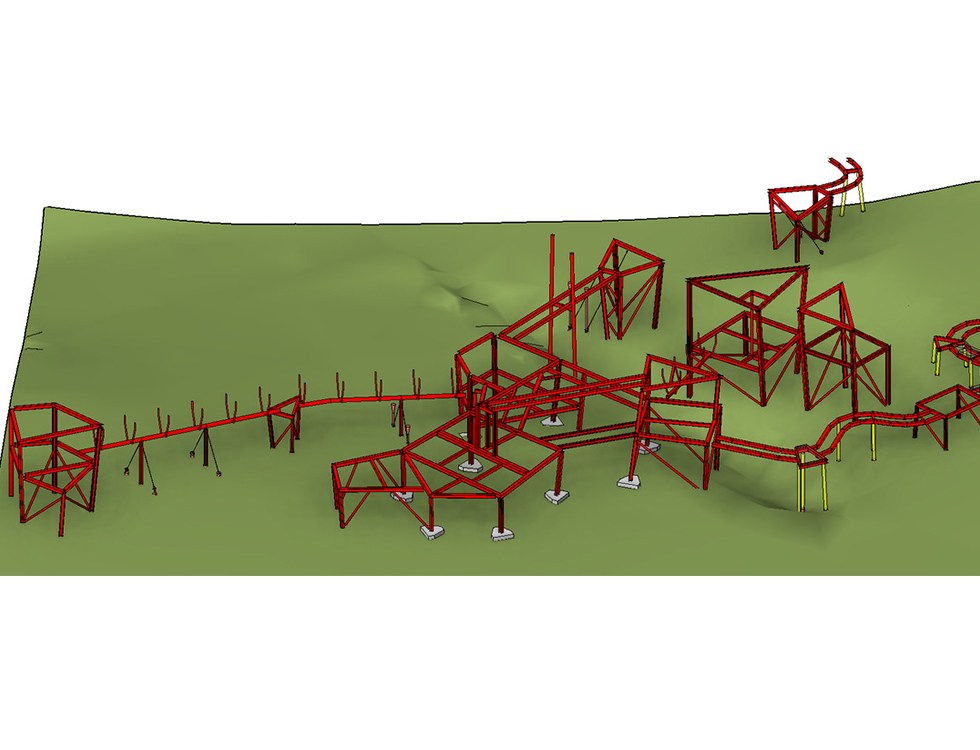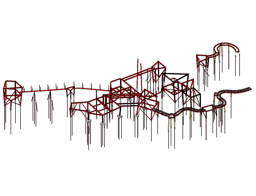 The steel frames comprise a series of universal and hollow rolled steel sections with local bracing and tension (Macalloy bar) restraints. The main frames generally extend to a first floor raised platform level, except for four towers which extend to a second-floor level. Catenary rope bridges are suspended between the towers.