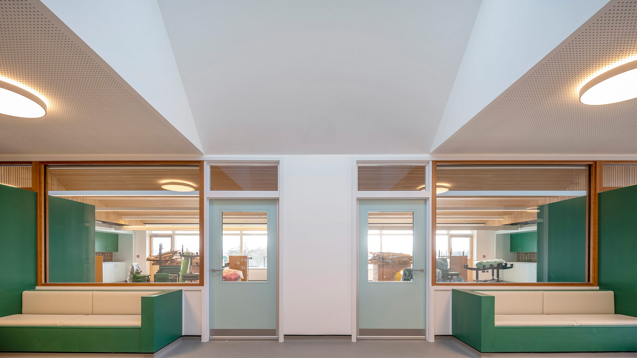 Around 80% of the students use wheelchairs, and the whole layout has been designed with this in mind. Specialist rooms including physiotherapy and sensory spaces sit next to the classrooms, separated by a run of furniture that doubles as storage and seating. Classrooms look out over open countryside and open directly onto the playgrounds.