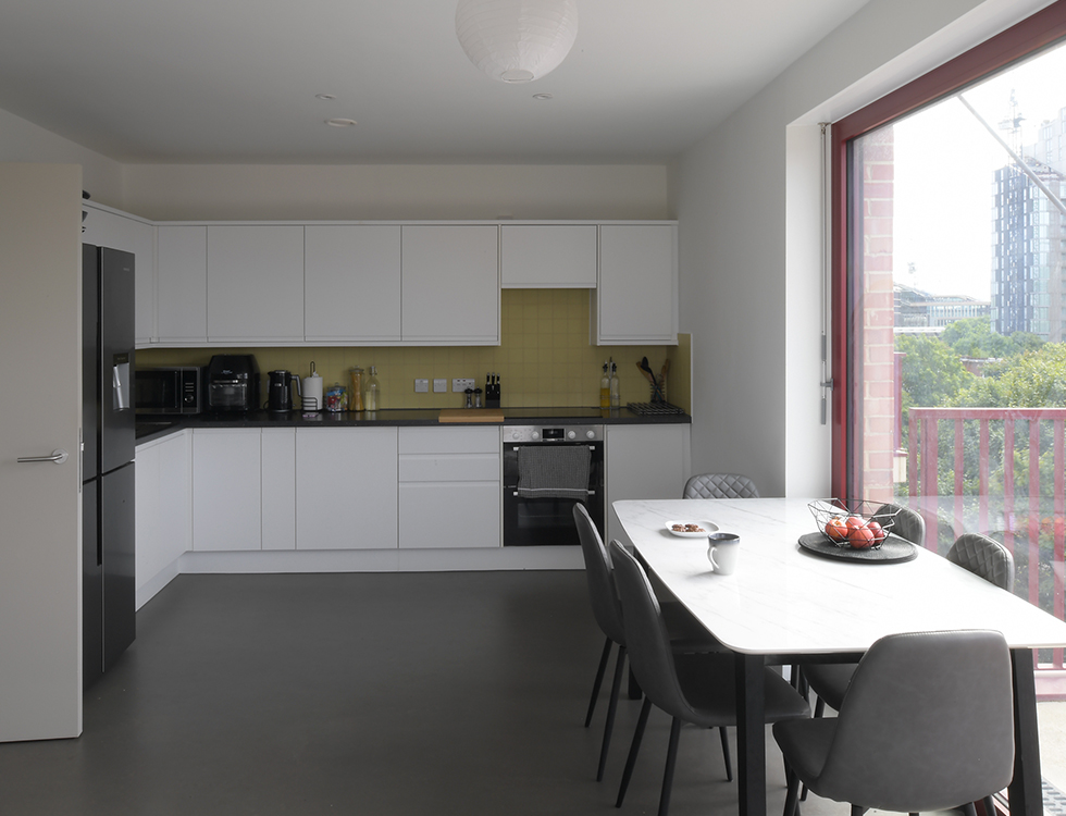 The tallest building on the site accommodates the ten flats, each of them with triple-aspect access to air and sunlight. At the lower levels, in-set balconies provide privacy from the nearby park and play facilities, while the higher levels feature generous cantilevered balconies with views over the treetops.