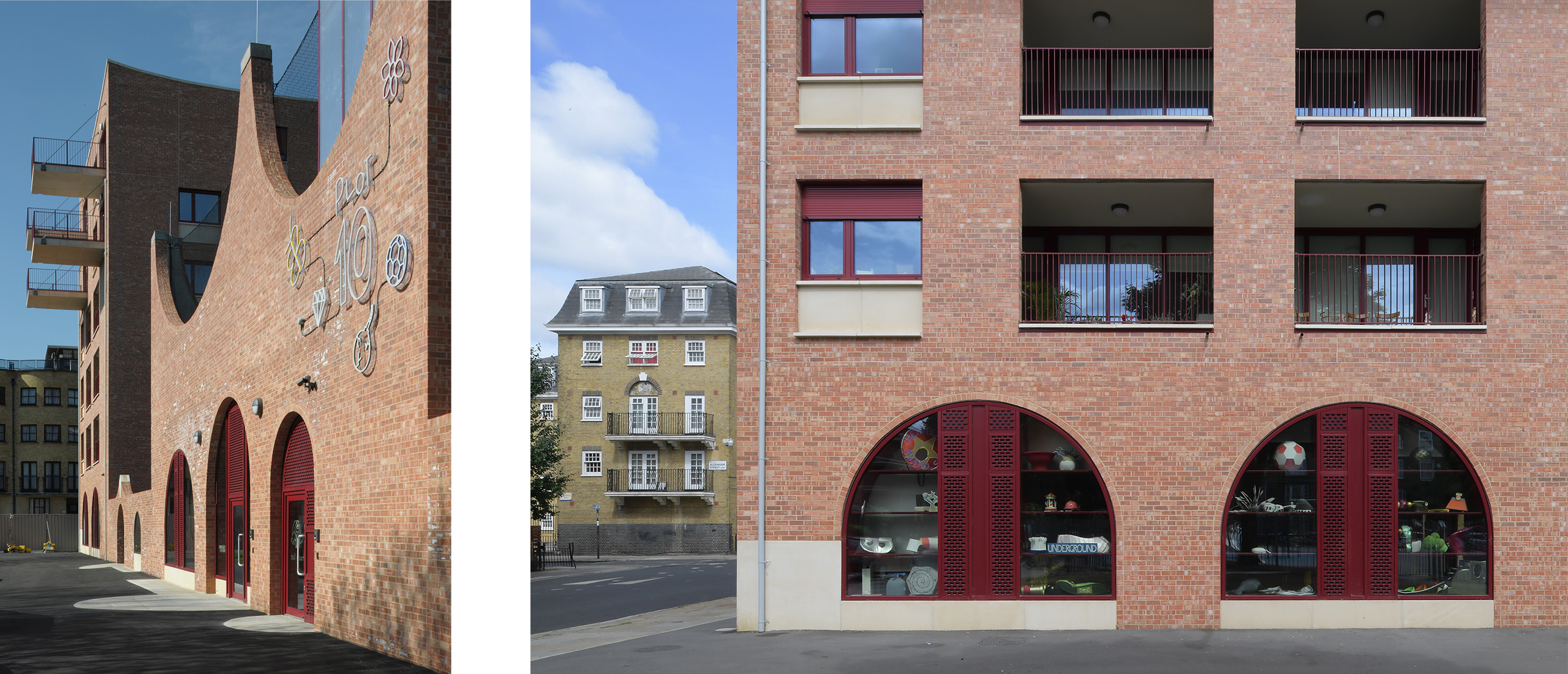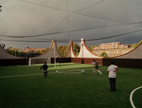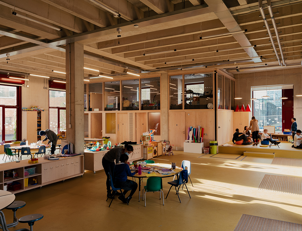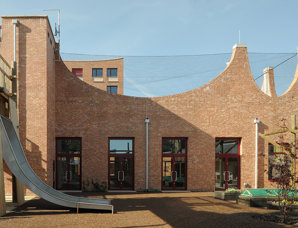 A nearby building, featuring an undulating brick crown and a rooftop football pitch, is home to Plot 10, a childcare group for local children. The interior space is designed and built to withstand rough treatment, and features beautifully detailed concrete ribs across the ceilings.