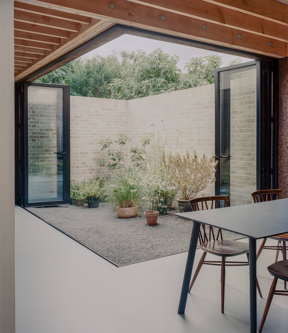 The small, confined site also posed significant logistical challenges. Access was heavily restricted via a small alley adjacent to a neighbour’s property, one that also served as a communal access to the terraces on either side. The site is hemmed in by neighbouring properties and landlocked between nine neighbourhood gardens. To get construction vehicles and services to the plot the design team had to carefully consider how the house could be constructed, which meant working closely with the tendering contractors. Use of a crane to move materials was prohibited. The design maximised the footprint by building right up to the neighbouring boundaries, and included a subterranean mini-basement to half of the site’s footprint. The team had to consider mature trees in adjoining yards and ensure no undue stress was caused to their roots.