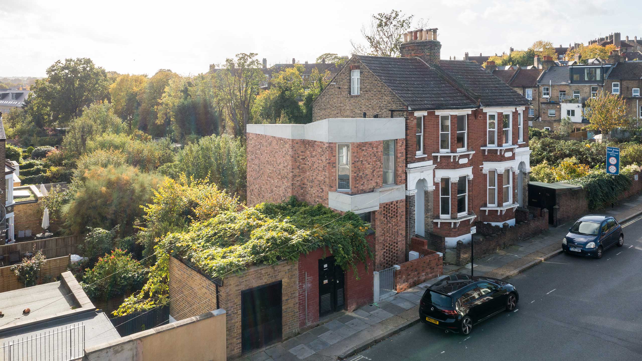 The house serves as a bookend to the short terrace. The building’s parapet folds elegantly around the corner, earning the home its moniker. And the red brick striped with concrete bands subtly references the surrounding Victorian terraces. Hit-and-miss brickwork on the façade facing the street allows indirect light into the front stairwell, while affording occupants privacy from passing foot traffic.