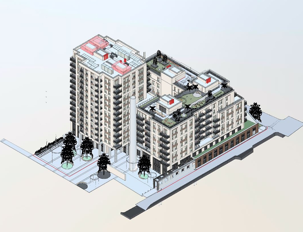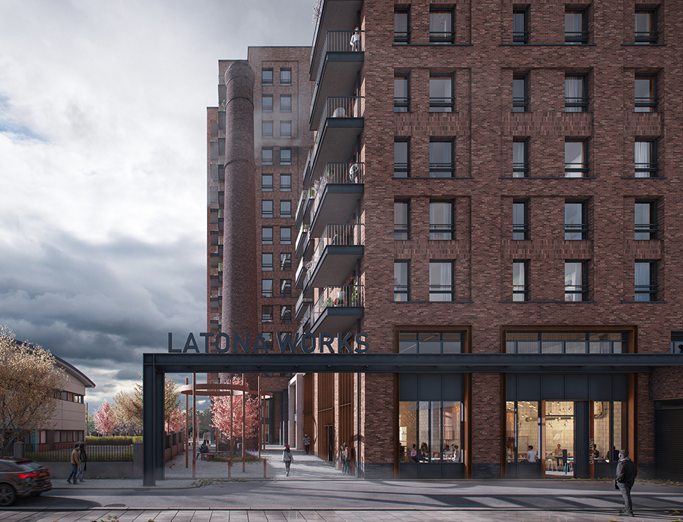 A 36.5m high chimney to the east of the site has been retained as a nod to the history and former use of the site.