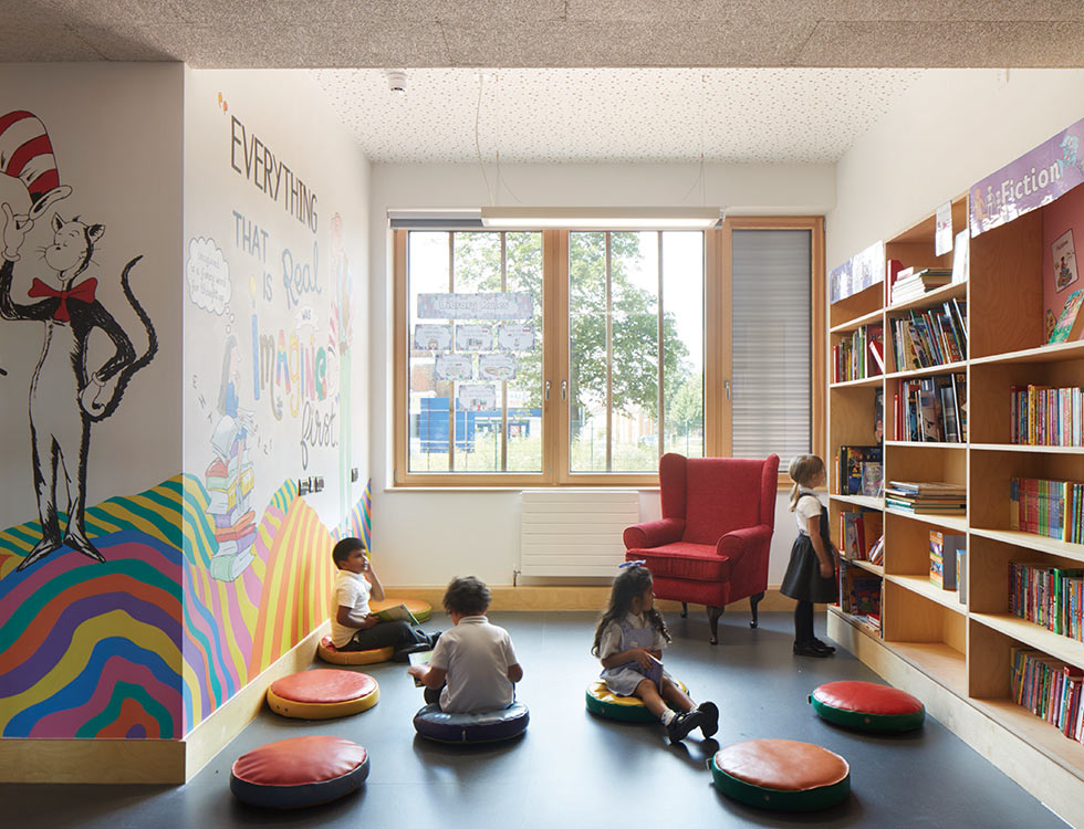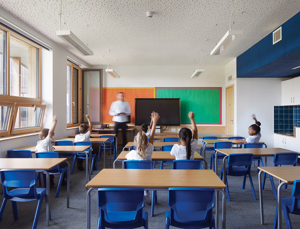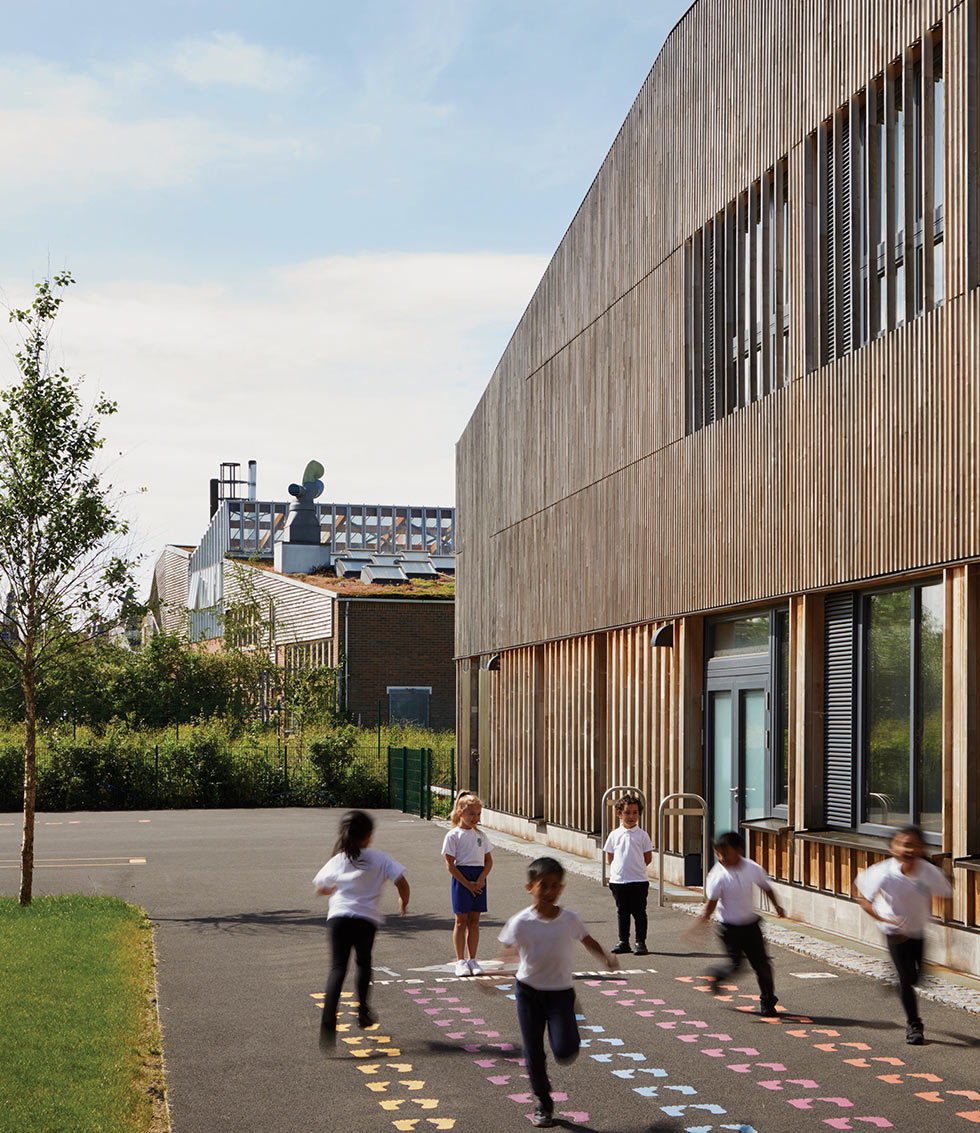 The school, which accommodates around 420 pupils aged 5-11, is a two-storey, lightweight Larsen truss, timber-framed building. The design brief called for the school to be highly efficient, low energy use and low water consumption, healthy and comfortable. This was achieved by designing a scheme for Passivhaus Plus standards, which required a tight collaboration between all designers to ensure heat loss from the building was minimal. A ground-source heat pump augments the high-efficiency envelope and insulation.