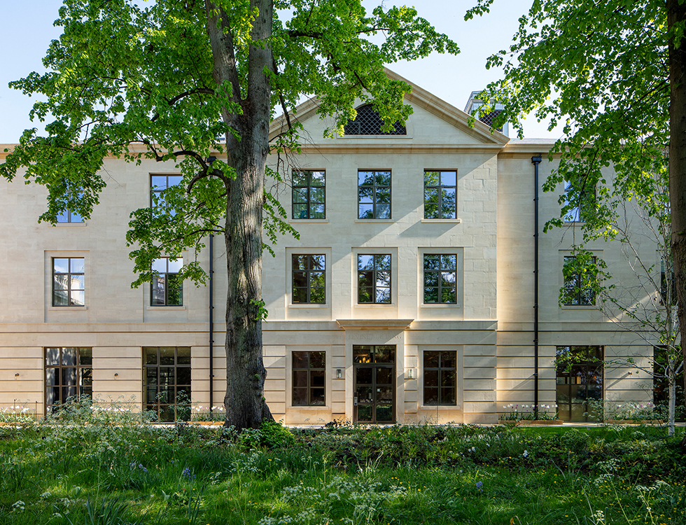 The Levine Building provides teaching facilities, 46 ensuite student bedrooms, social spaces including a 148-seat auditorium, a large flexible function room, and rooftop garden. An informal study and community space adjoins a new café, and a new library wing provides disabled access to the listed library.