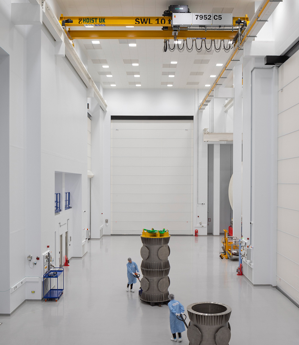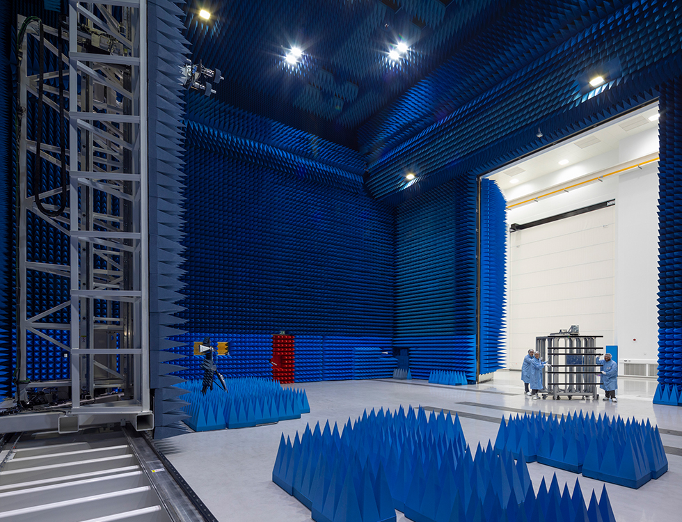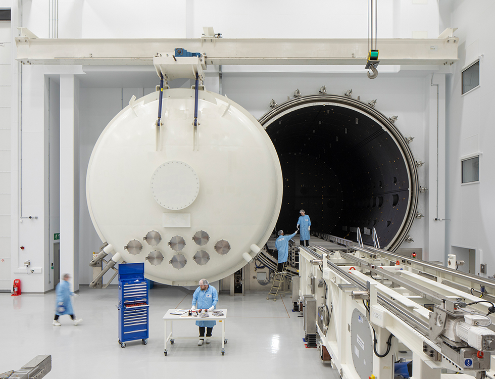 A new National Satellite Testing Facility on the Harwell campus in Didcot, Oxfordshire. The five-storey building measures approximately 75m x 60m on plan and is formed of a large central corridor with a series of connecting bespoke testing chambers, including acoustically isolated rooms, electromagnetically sealed rooms and a 200-tonne thermal vacuum chamber to replicate conditions in space.