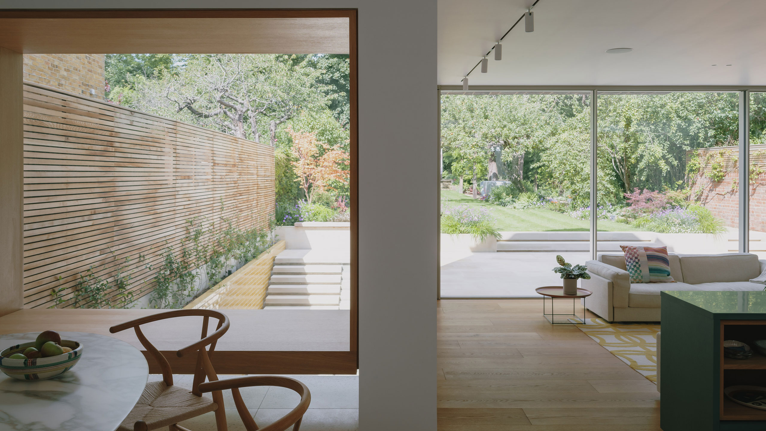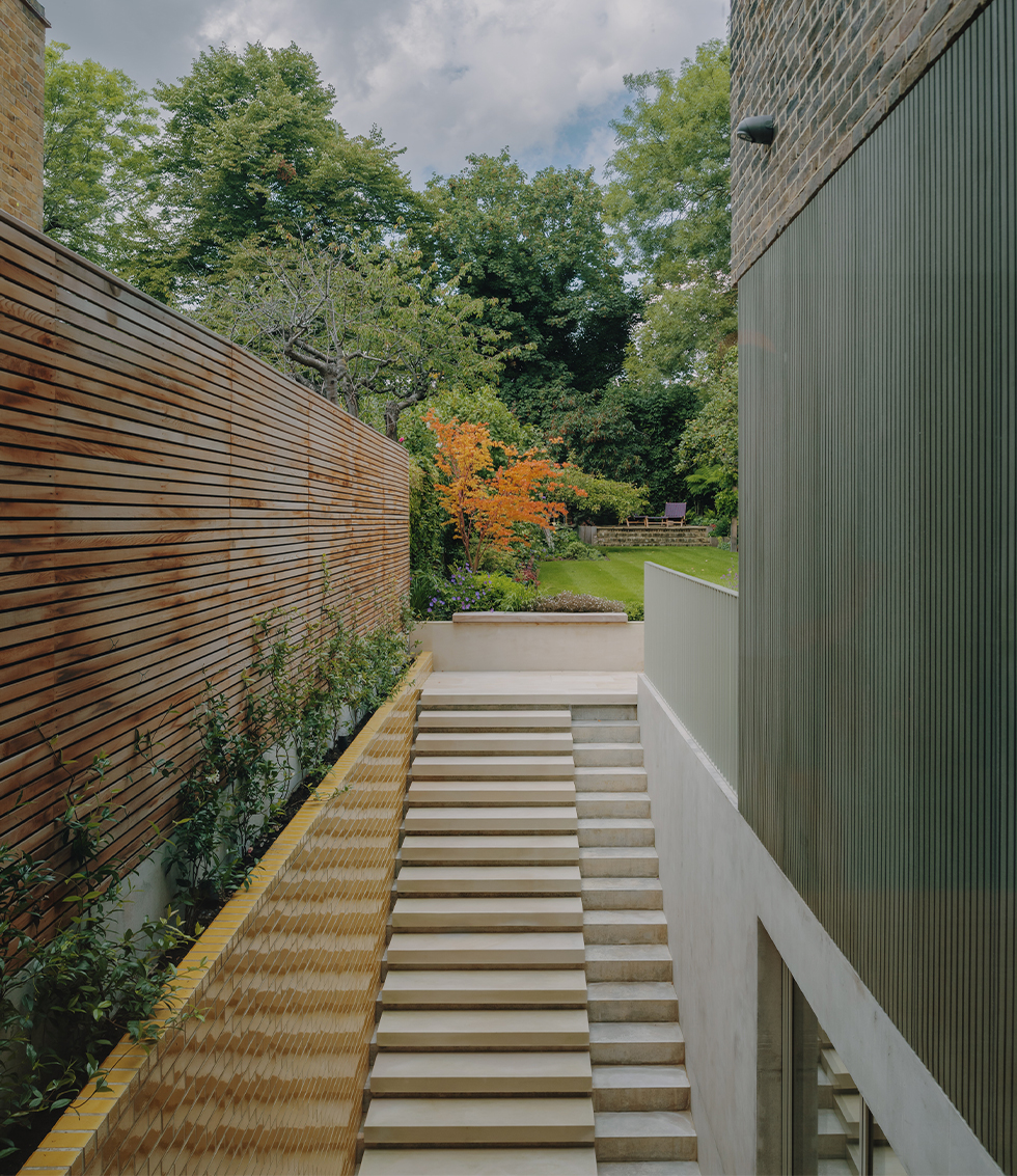 On the ground floor, a cantilevered window projects over the lightwell stair landing, creating a visual connection to the garden and framing views from inside the home.