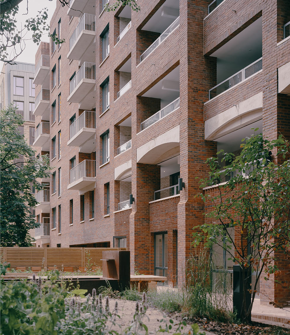 Initially, all balconies were proposed to be precast and fabricated offsite but, thanks to careful detailing, it was possible to construct them in situ, which reduced lead times and simplified fixings. Other ‘heavy’ elements of the cladding, such as the precast feature canopies surrounding the entrances and brick arches for the colonnade, also posed a challenge to develop elegant and buildable details.